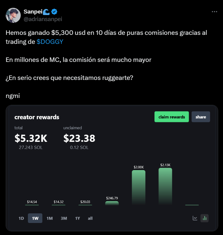 Antes el modelo de negocio de las memecoins era pumpear el precio lo máximo posible y huir con los fondos, pero las creator rewards cambian el juego totalmente. Estas recompensas hacen que crear memecoins sea RENTABLE.